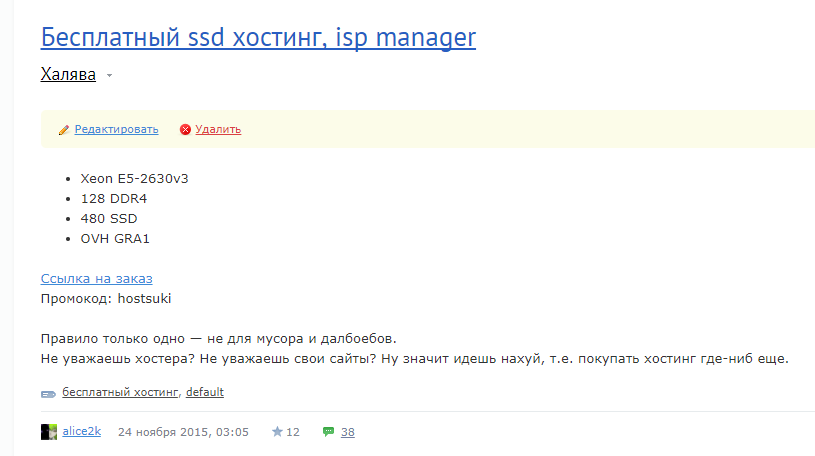 ![]() alice2k.hosting Yacolo | ДЦ ovh | Suki.host | skladchik | Рефералы ABCD Team | HostSuki Новостные ресурсы: Hostsuki.pro, Hosting.kitchen Другие полезные проекты: abuse.watch | host.report, VM.center Сообщества: default.town | lain.network | host.community | srv.house Сервер собран в декабре 2015, рейтинг 2015 ВАЖНО - ЭТО ЗАКРЫТЫЙ СЕРВЕР. Закрылся он в феврале 2016 года, потому что OVH заблокировало его. Так как в Новый год была раздача халявы, его загадили сразу. ![]() Его IP был для истории 149.202.65.70, т.к. сейчас поддомен s1 ведет на заглушку, памяти истории. Итого проработал он около 4 месяцев, абсолютно убыточный был, тысяч 15 было потрачено на этот эксперимент ;) |